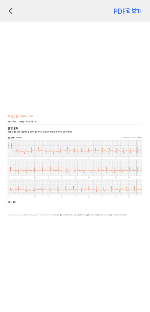 스마트 워치의 심전도 소견은 의학적인 판단에 사용될 만큼 정밀하지 않기 때문에 어디까지나 참고 정도만 하여야 합니다.