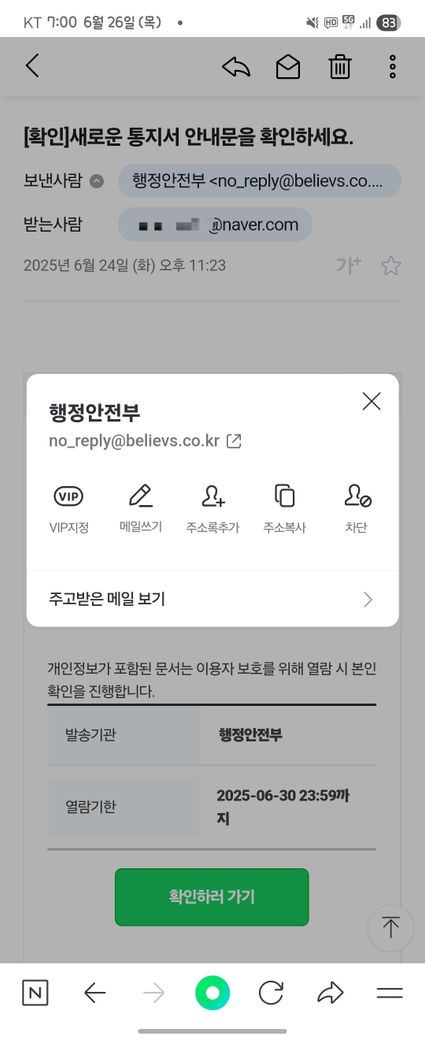 네이버 행안부 피싱메일 검색해보니 이상한 네이트나 희안한 메일들로 왔던데 이거는 답장 안되는 이메일로 와서 훔.... 아리까리하네요