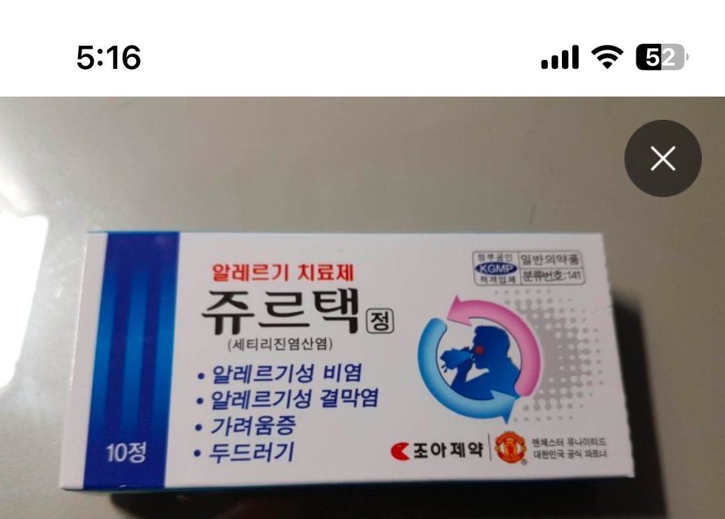말씀하신 것처럼 현재 상황과 같은 알러지 증상이 보이실 때, 항히스타민제인 쥬르택정을 복용하시면 증상완화에 도움이 될 수 있을 것으로 판단됩니다.