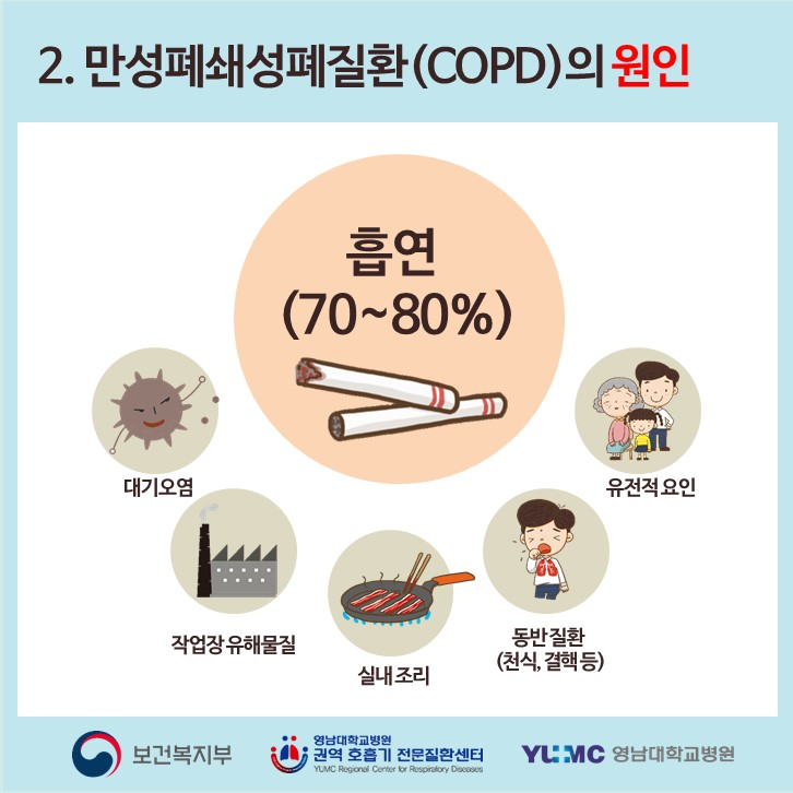 만성 폐쇄성 폐질환의 가장 중요한 발병 원인은 흡연으로 비흡연자에 비해 흡연자에게서 호흡기 증상의 발생과 폐 기능의 이상 소견이 더 자주 확인되며 간접 흡연도 원인이 됩니다.