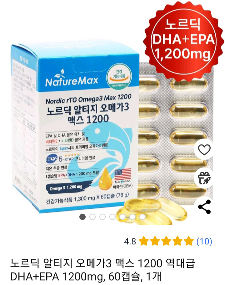 EPA와 DHA의 합이 1200mg이고, 알티지 공법으로 추출한 오메가3라면 순도가 충분히 높을 것으로 보입니다.
