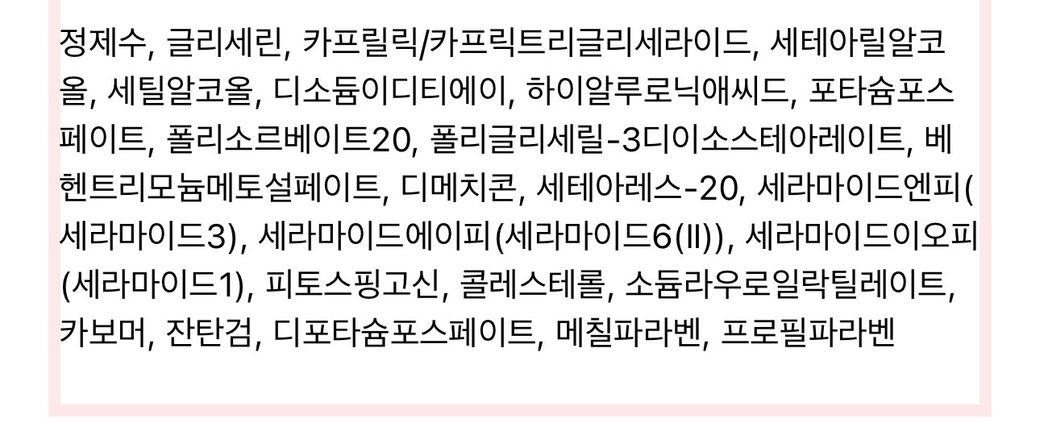 세안 뒤 깨끗한 손으로 펴바르곤 했는데 왜 이런건지.... 무슨 성분때문에 화끈거림이 나타나는 건지 알아내 되도록 그 성분을 피해 다른 제품을 사용하려고 합니다. 아래 사진이 사용했던 수분크림의 전성분입니다.