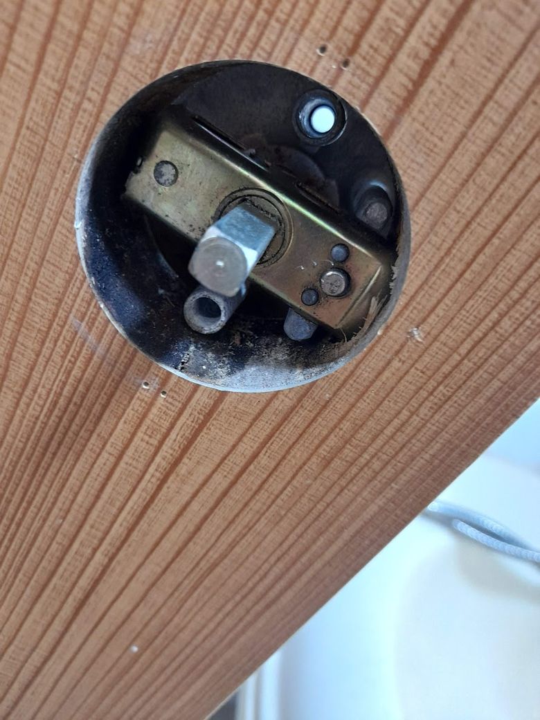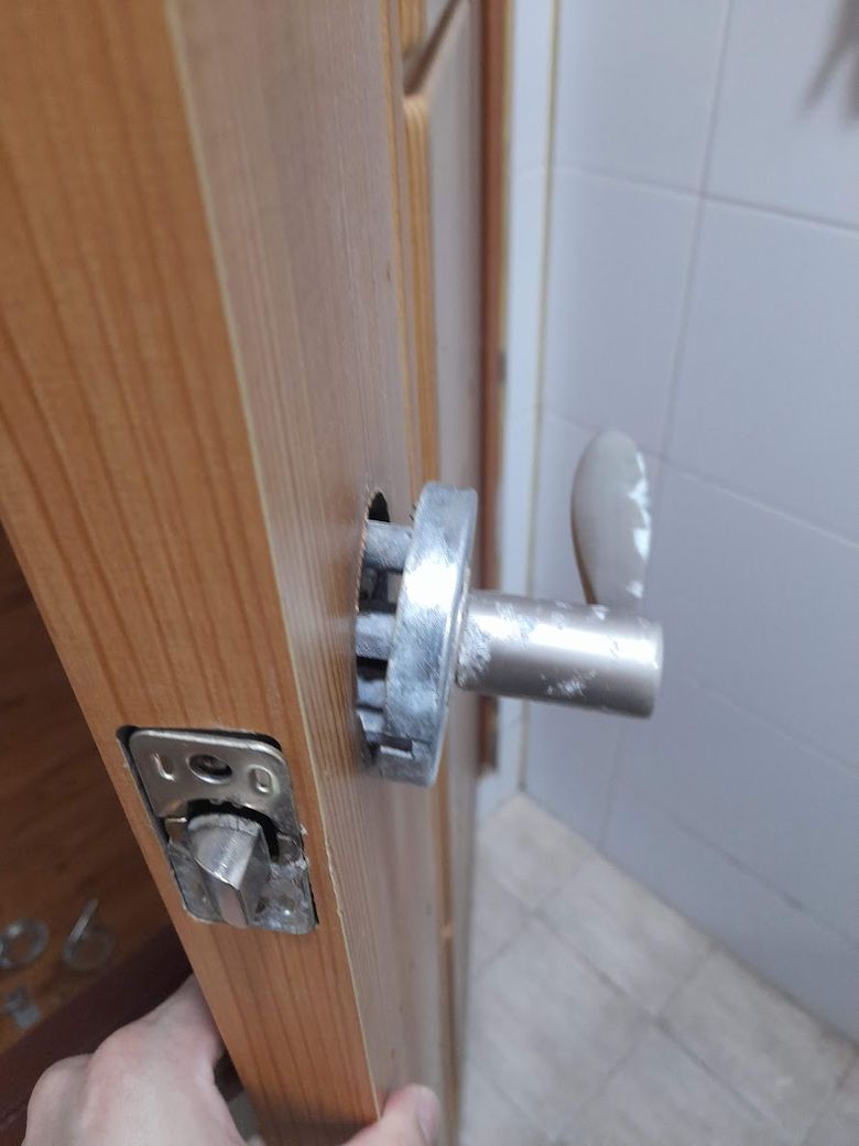 저도 얼마 전에 화장실 문이 고장나서 봤더니 작성자 님이랑 똑같이 돼 있었고 다른 분 께서 댓글달아 주신 그 동그란 놈도 이미 사가서 소용이 없더라구요. 그거 그냥 망치로 쳐 내셔야 합니다. 저는 그렇게 해서 교체했어요.ㅠ