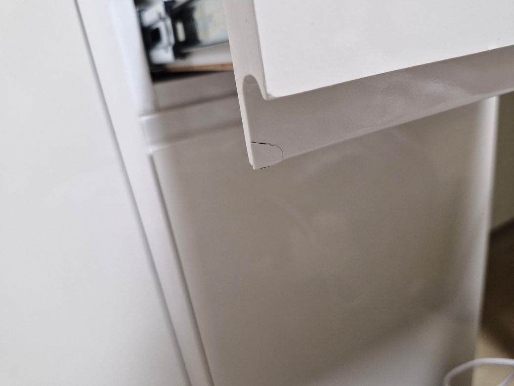 서랍장 열 때 다른 가구와 부딪히고 뽀각 소리나서 보니까 두꺼운 페인트 같은 부분이 달랑거려요ㅜㅜ 떨어지기 일보 직전이에요