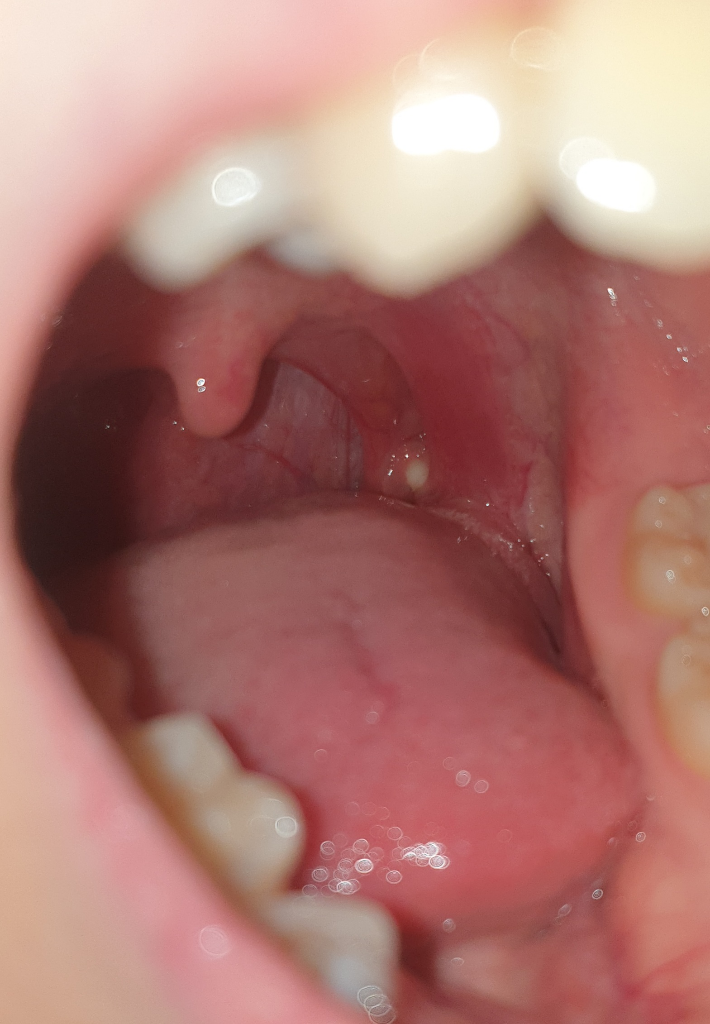 편도염이 있을 때 종종 관찰되는 삼출물로 보입니다. 편도염을 추정할 수 있는 근거가 되는 편이고, 이비인후과에서 확인을 받아보실수 있겠습니다.