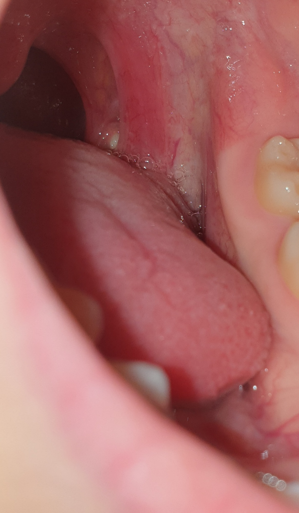 사진의 소견만으로 정확하게 판단하기는 어렵지만 편도의 석일 가능성이 가장 높아 보입니다. 아니라면 반대로 구내염일 수도 있겠습니다. 일단 상태 평가를 위해서 이비인후과 진료 및 검진을 받아보시길 권고드립니다.
