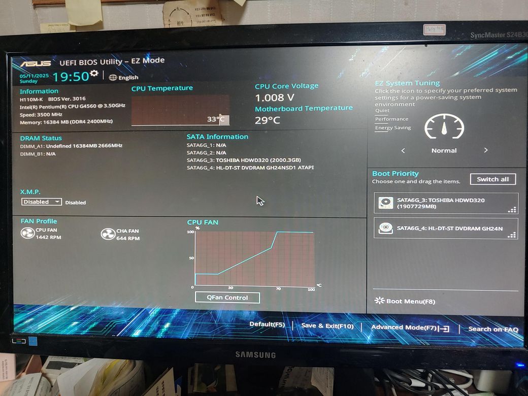 사진을 보면 BIOS 화면에서 하드디스크(TOSHIBA HDWD320)는 정상적으로 인식되고 있습니다. 하지만 윈도우가 부팅되지 않고 계속 BIOS 화면만 나오는 상황이라면, 하드디스크 자체의 손상, 운영체제 파일 손상, 또는 부팅 순서 문제일 가능성이 있습니다.