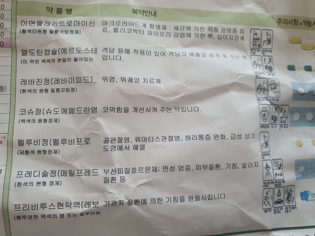 현재 복용 중인 감기약을 살펴보면, 항생제(이연클래드로마이신), 거담제(엘도트렐캡슐), 위장약(레바진정), 진해거담제(코슈정), 진통소염제(펠루비정), 스테로이드(프레디솔정), 그리고 기침약(프리비투스현탁액)을 포함하고 있습니다.