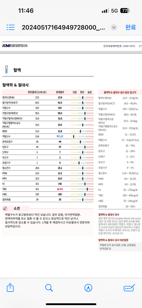 건강검진 당시 좀 피로감이 있었고 백혈구 수치가 낮게 나왔습니다.
