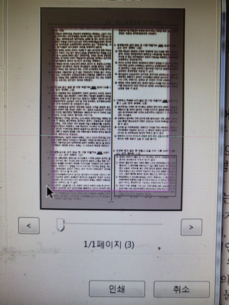 사진처럼 저 분홍색 라인을 문서의 전체 크기와 같이 맞춰야 하는데 어떻게 맞춰야 할까요? 파일은 PDF 형식이고 캐논 LBP 6030 모델입니다