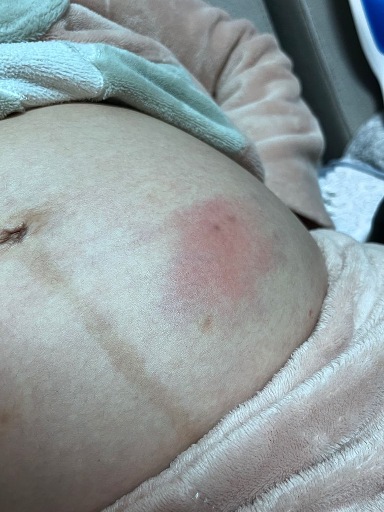올려주신 사진으로 미루어 복부 주사 부위에 염증 또는 2차적 감염의 가능성이 생각되므로 병원 진료와 약물치료를 받을 것을 권합니다.