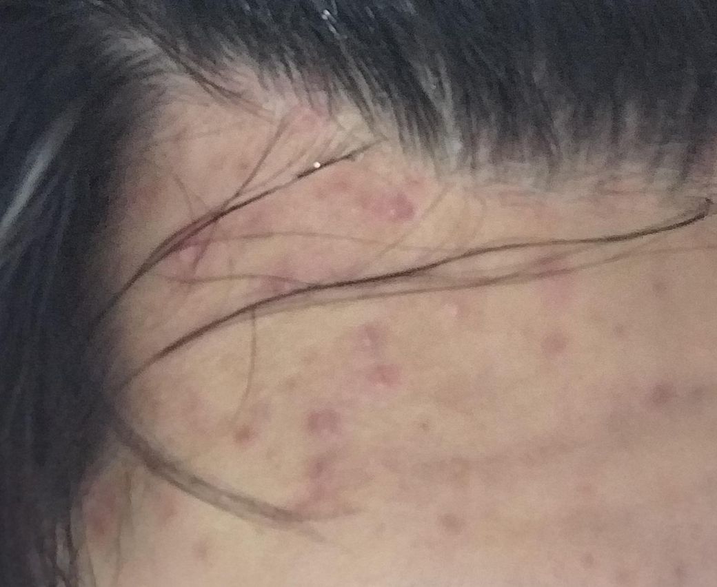 사진에서 더 눈에 띄는 것은 이마·헤어라인 부위의 여드름과 염증입니다. 이런 염증 때문에 두피가 붉어 보이거나 머리가 듬성해 보일 수는 있으나, 탈모와는 별개인 경우가 대부분입니다.