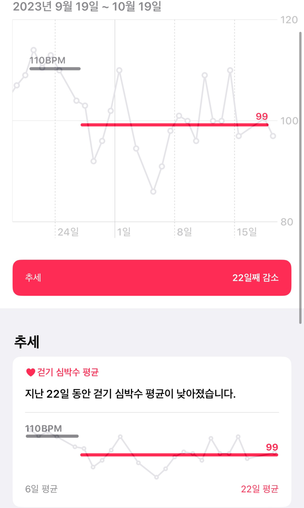 최근 한달 걷기 심박수 낮아짐 질문