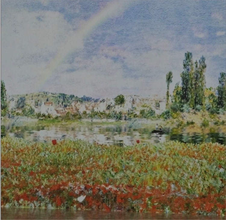 취리히의 에밀 뷔를레 재단 미술관에 소장된 이 작품은 양귀비 꽃이 만개한 들판을 그린 작품으로, 모네가 자주 묘사한 자연의 섬세한 색감과 빛을 잘 보여줍니다.두 작품 모두 모네의 빛과 색의 변화를 포착한 특징적인 작품들로, '베퇴유' 지역에서 그린 여러 작품 중 일부입니다. 재구성된 사진에서 이 두 작품을 비교하거나 조합해본 것일 수 있는데, 그런 관점에서 보면 모네의 빛과 색의 변화를 현대적 방법으로 재구성하는 흥미로운 시도라고 할 수 있는 작품이지요..