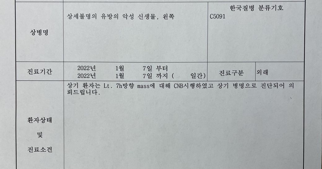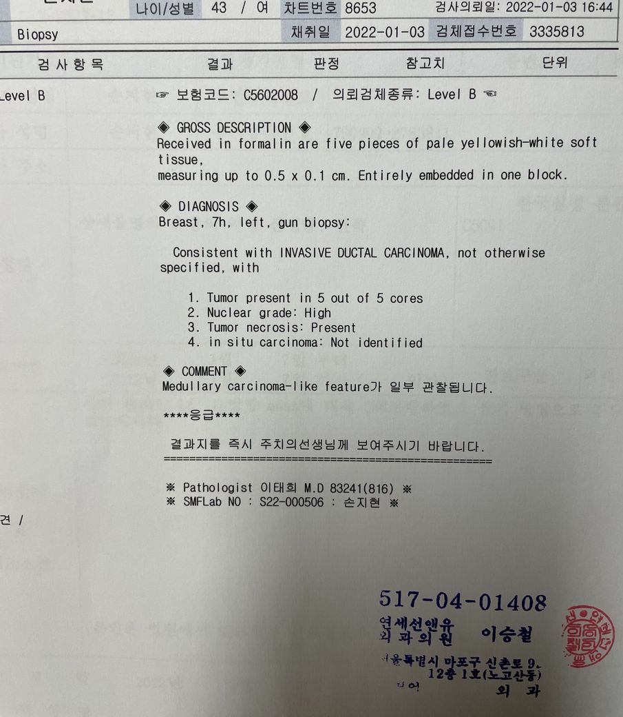 유방의 조직 검사 결과 유방암에 해당하는 결과가 나왔습니다.