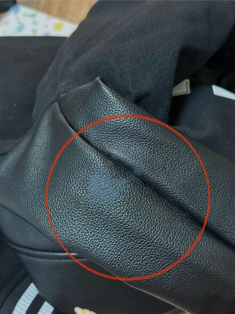 과잠 팔 가죽부분에 디퓨저 용액을 흘렸는데 저렇게 자국이 남았어요.. 없애거나 조금 옅게 하는 방법 있을까요? 흘리자마자 바로 물티슈로 닦았는데