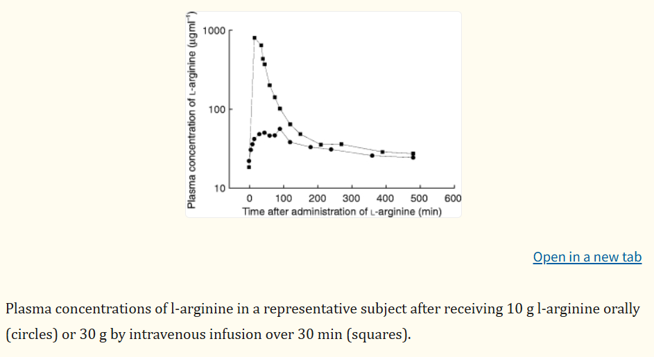 아래 그래프는 아르기닌을 경구로 섭취했거나, 주사로 투여한 후의 혈중 농도를 조사한 그래프라고 보시면 되겠습니다. 그림에서 보시는 것과 같이, 아르기닌은 투여 후 200분 정도, 즉 3시간 정도가 지나면 투여 전과 유사한 만큼 그 혈중 농도가 떨어지게 되어 인체 내 일부는 저장되고, 일부는 배설된다고 보시면 되겠습니다.