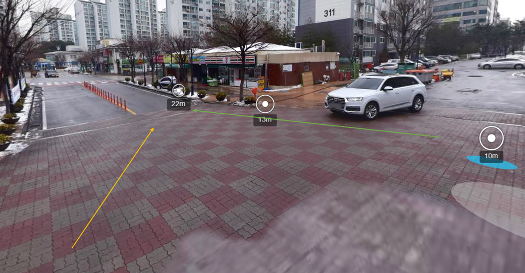 안녕하세요 자동차 사고가 났습니다. 아파트 단지 내에서 발생한 사고입니다. 저는 좌회전을 했고 상대차는 우회전을 하면서 사고가 난 상황입니다. 상단의 로드뷰 사진을 보시면 노랑색 화살표처럼 제가 가는 방향이고 초록색 화살표는 상대방차 진행 방향입니다.