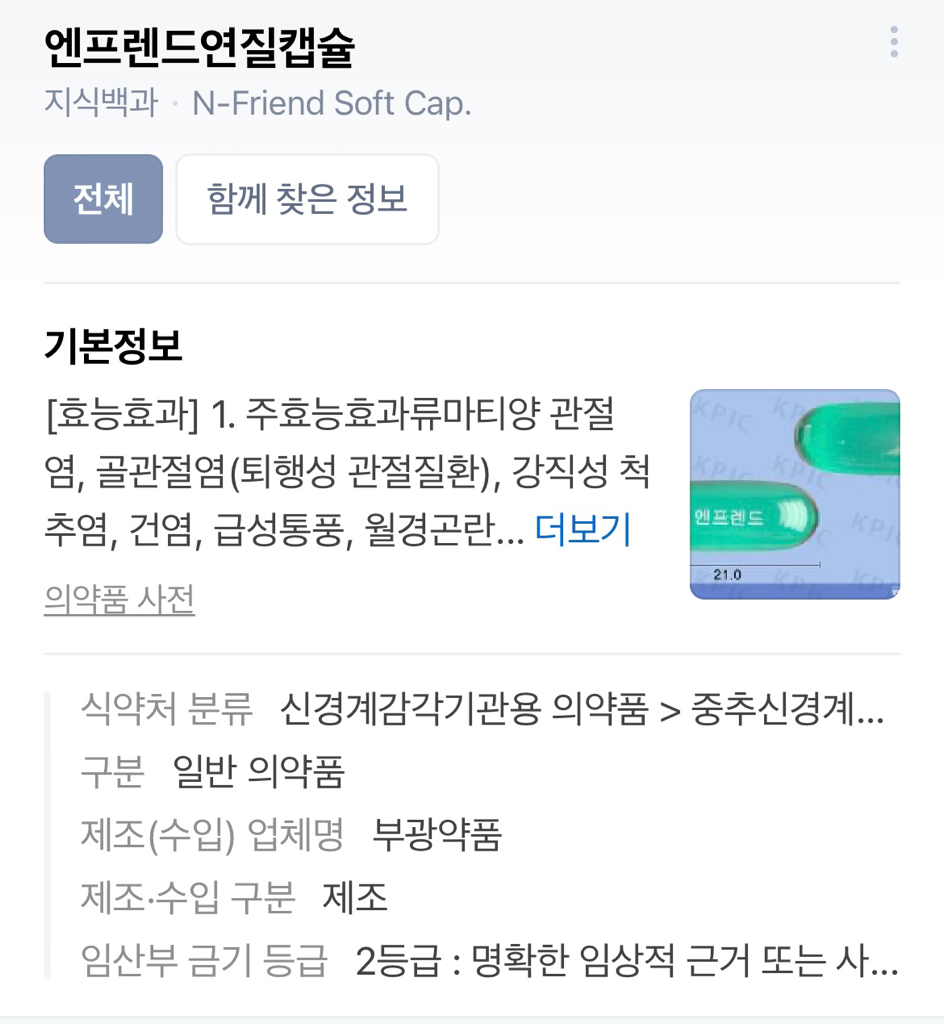 엔프렌드 연질캡슐은 나프록센 성분이며 나그란 구강붕해정은 나라트립탄 성분입니다.
