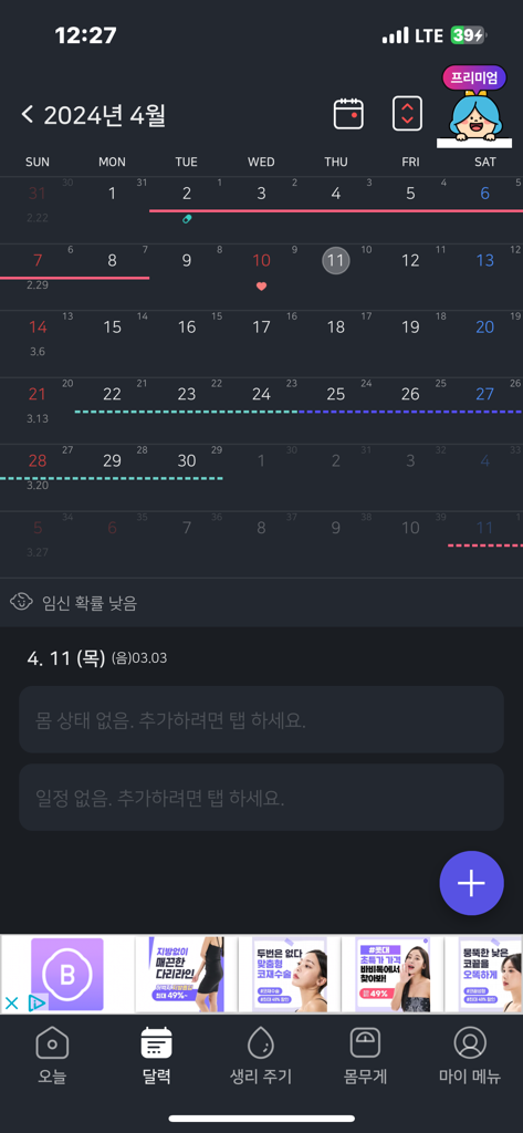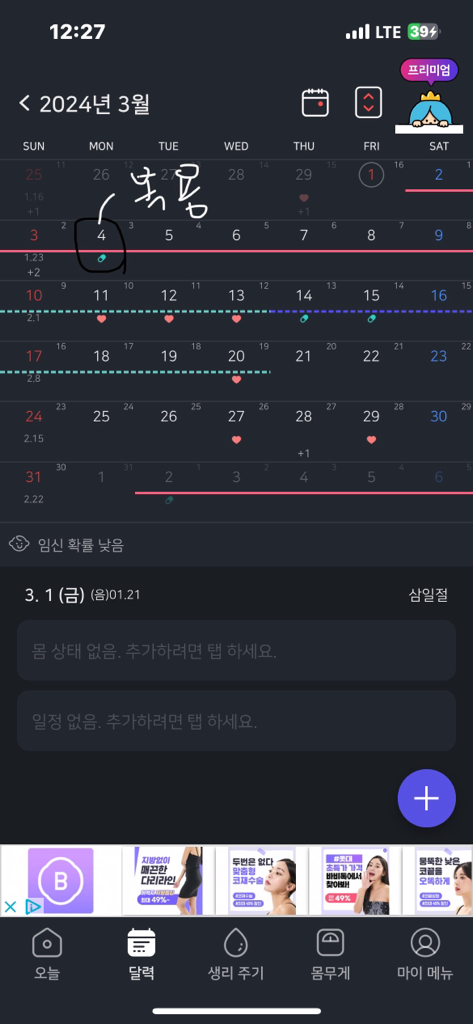 3. 4월 8일에 생리가 끈났는데 오늘 아침에 배가 살살아프더니 갈색혈로 조금 비춰졌는데 부정출혈 일까요?