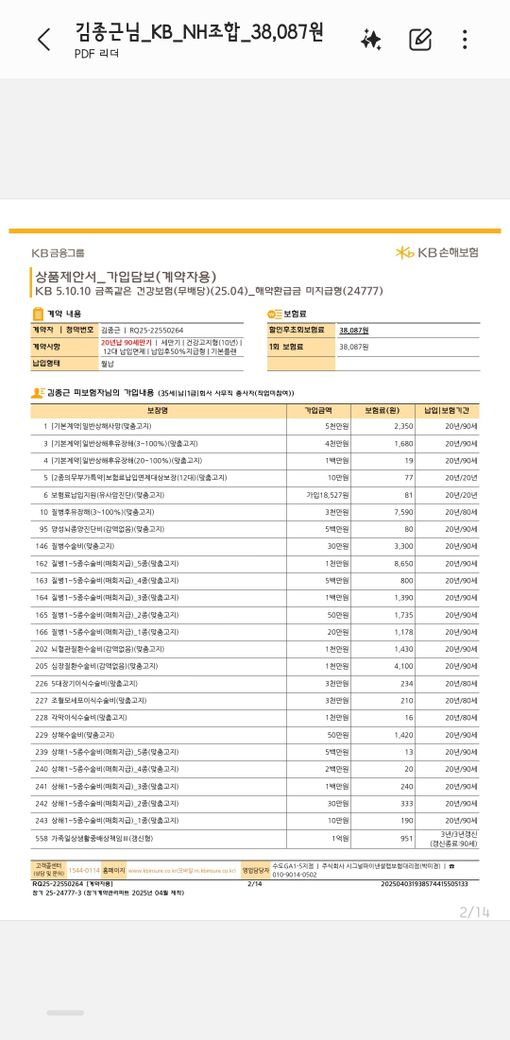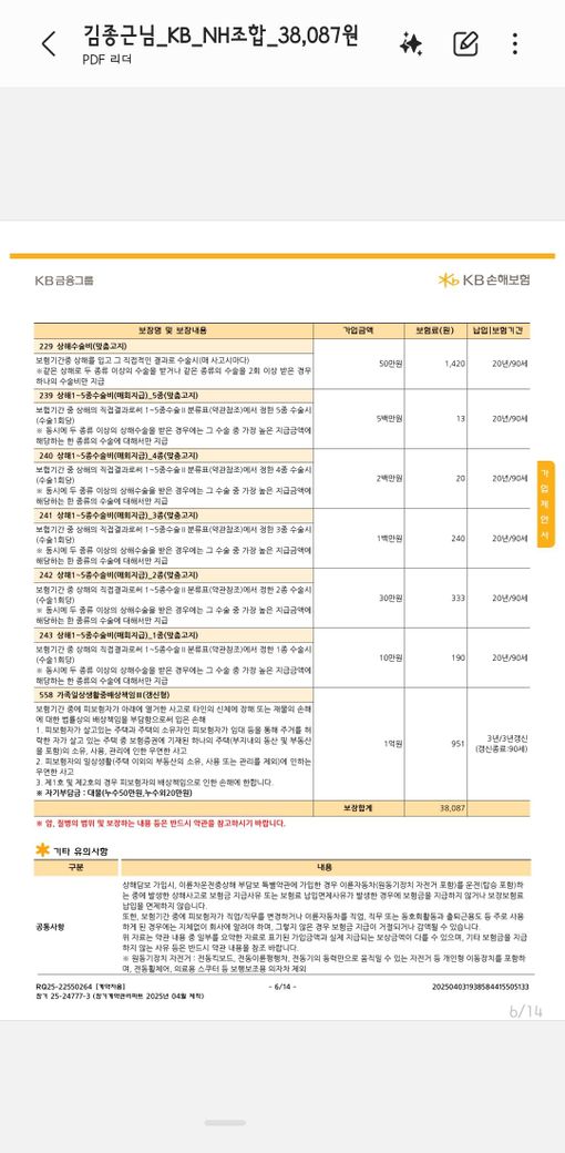 필수 가입 진단비는 농협으로 수술비는 KB로 구성을 한것으로 보입니다.