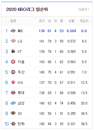 현재 순위 1등인 NC의 경기수는 138경기이고