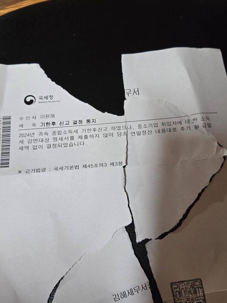 아마 기한후신고 시 중소기업 취업자 소득세 감면을 적용하신 것으로 보이는데, 중소기업 취업자 소득세 감면대상 명세서 제출을 하지 않으셔서 감면 적용 없이 결정이 된 것으로 보입니다.