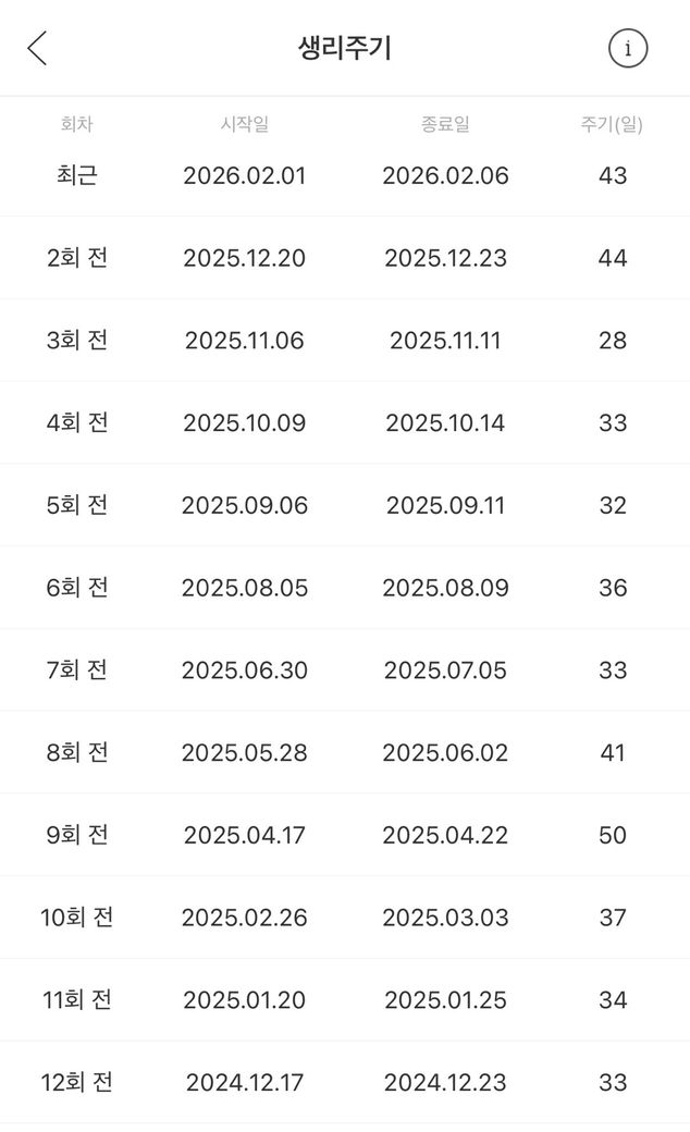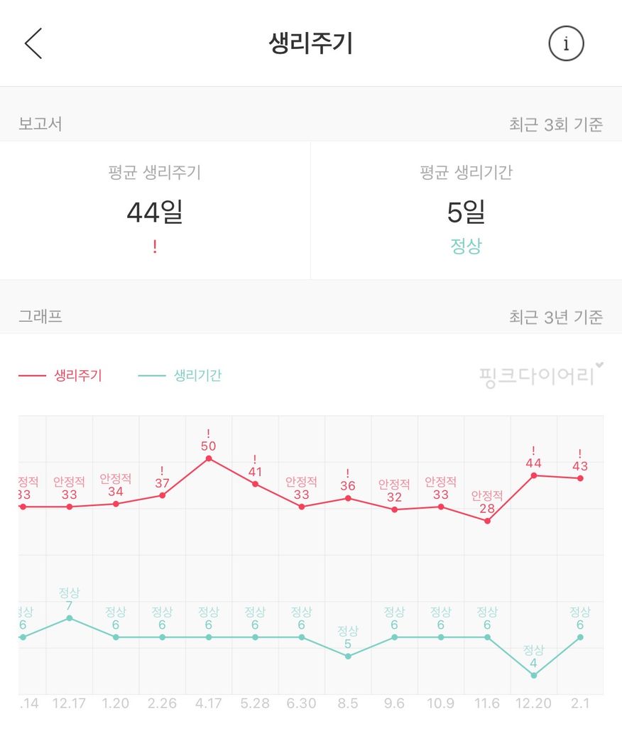 제공해주신 기록을 보면 생리 주기가 대략 28일에서 50일 사이로 장기간 변동하고 있고, 35일을 넘는 주기가 반복됩니다. 이는 의학적으로 ‘만성적 월경불순’에 해당합니다.