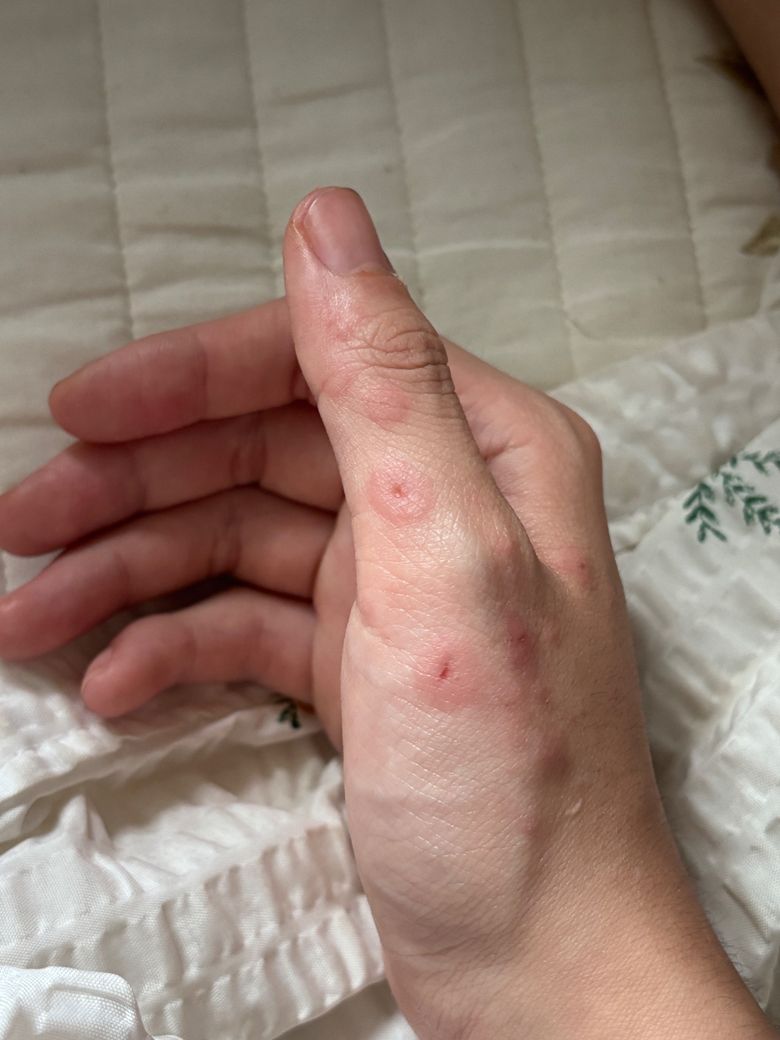 손에 벌레물린것처럼 가운데에 상처있고 그주위가 동그랗게 빨갛고 부어있어요 여기 뿐만아니라 발도 이상한 알러지가 났어요 발 전체가 간지러워와요 한번 긁으면 계속 가렵고 긁어야하고 긁어도 아프기만해요 한번 긁으면 다른 주변 부위로 퍼져있어요