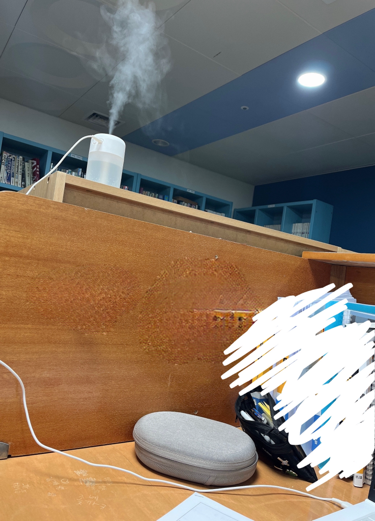 겨울이 되고서 독서실에 히터를 너무 빵빵하게 틀어서 안구건조증이랑 피부도 뒤집어져서 미니 가습기를 장만했는데요 전자기기에도 가까이두면 안되고 얼굴에도 너무 가까이 두면 안된다고 해서요.. 어디에 둬야 좋나요? 일단은 잘 모르겠어서 여기에 두긴했는데 어디사 좋을까요..ㅠ