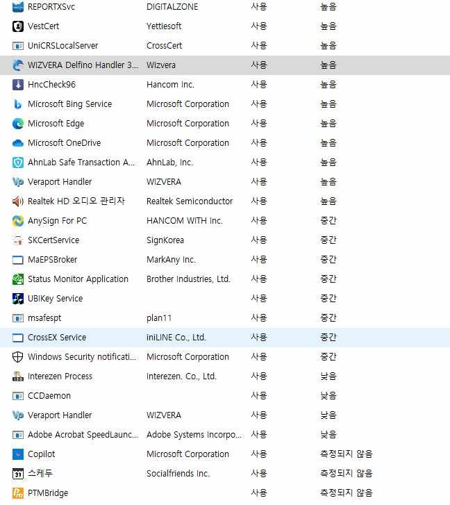 필요없는 프로그램은 사용중지시키고 싶은데 이 중에 필요없는 프로그램이 있는지 궁금해요.
