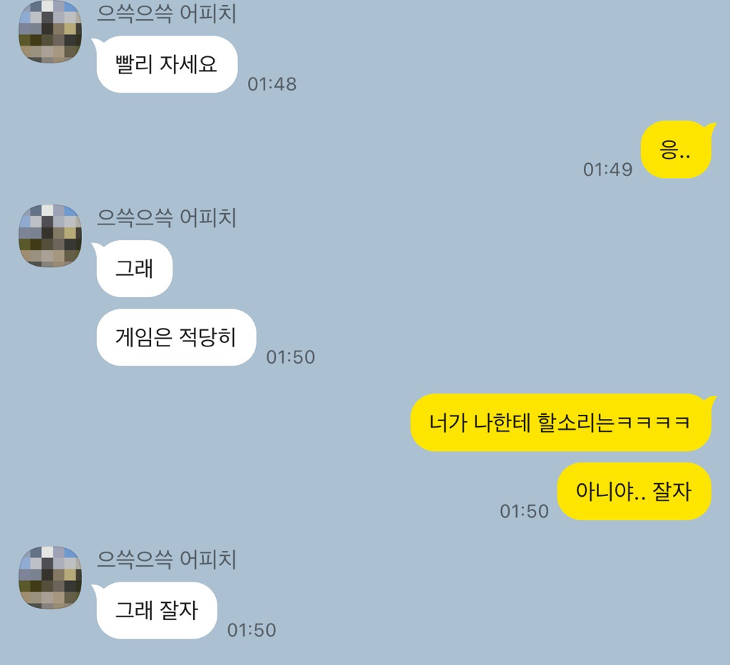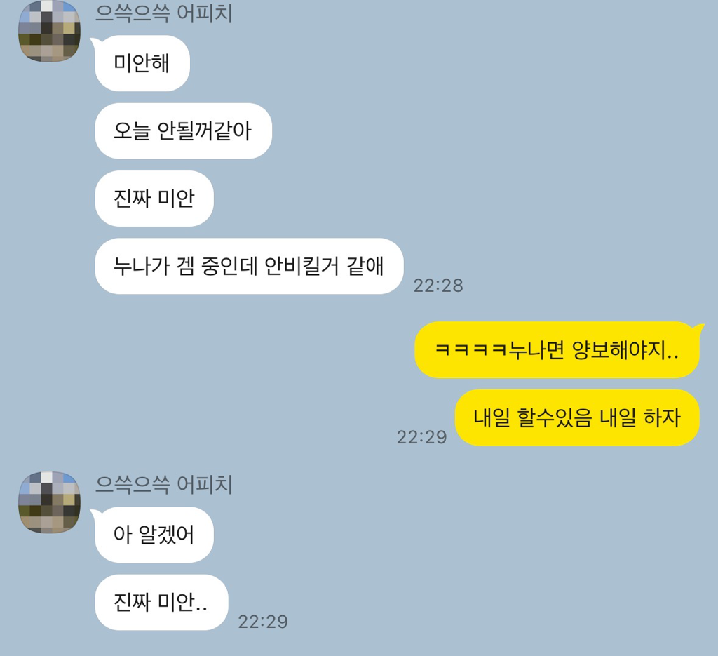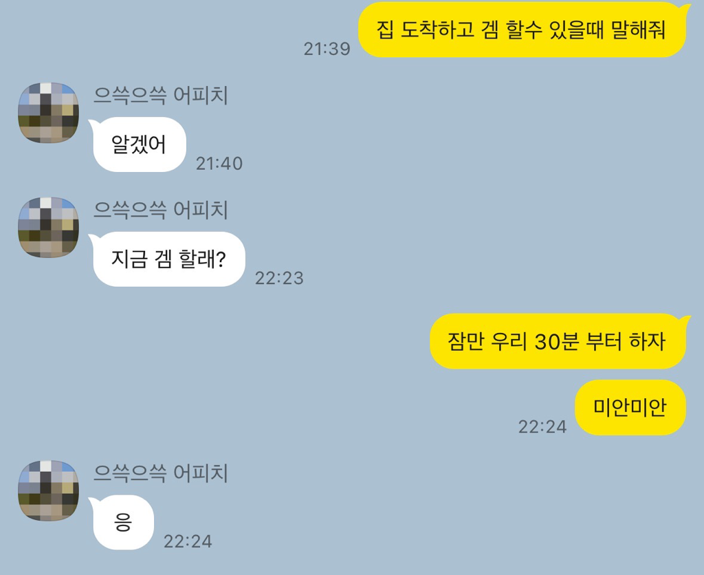 젤리도 사와달라하면 사다주고.. 같이 게임하자니까 알겠다고 하고 진짜 뭔일 있어서 약속 못지키는 날에는 진짜 너무 미안하다고만 세번 반복해서 말하기도 하고