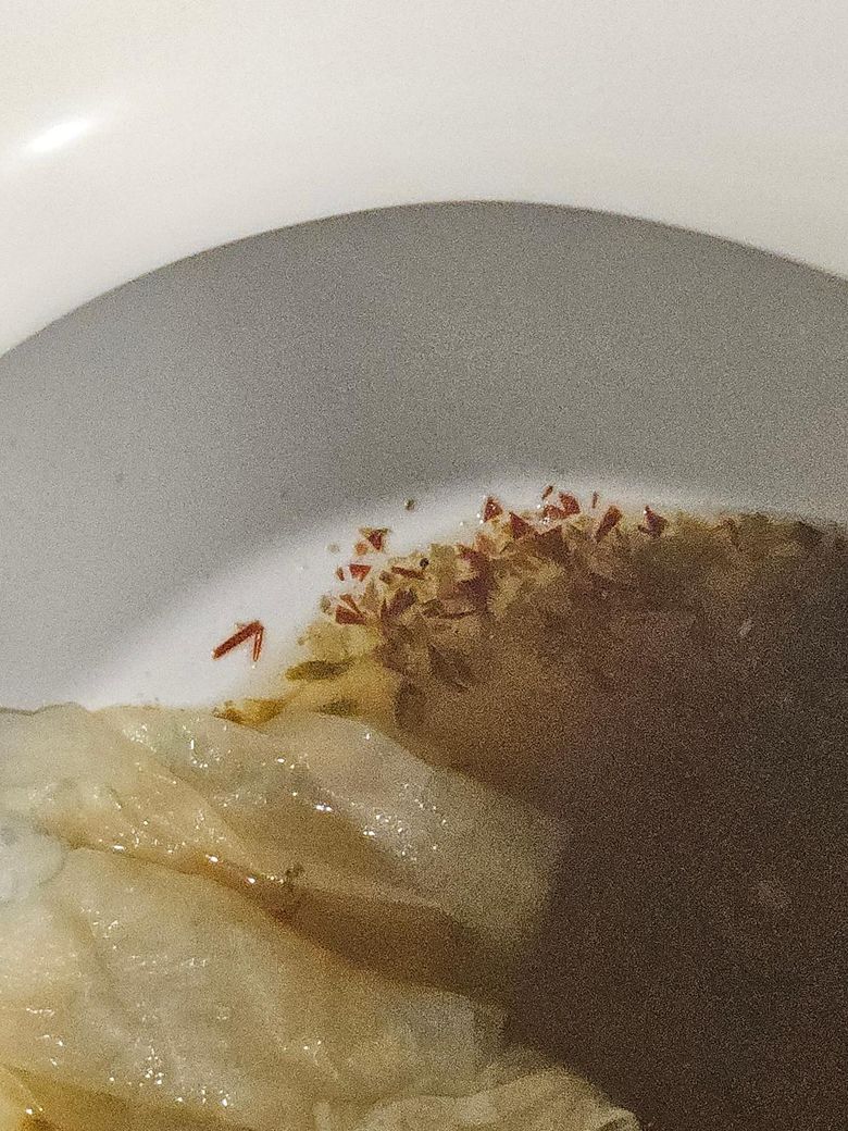 빨갛게 보이는 조각은 음식 찌거기의 일종으로 보입니다.