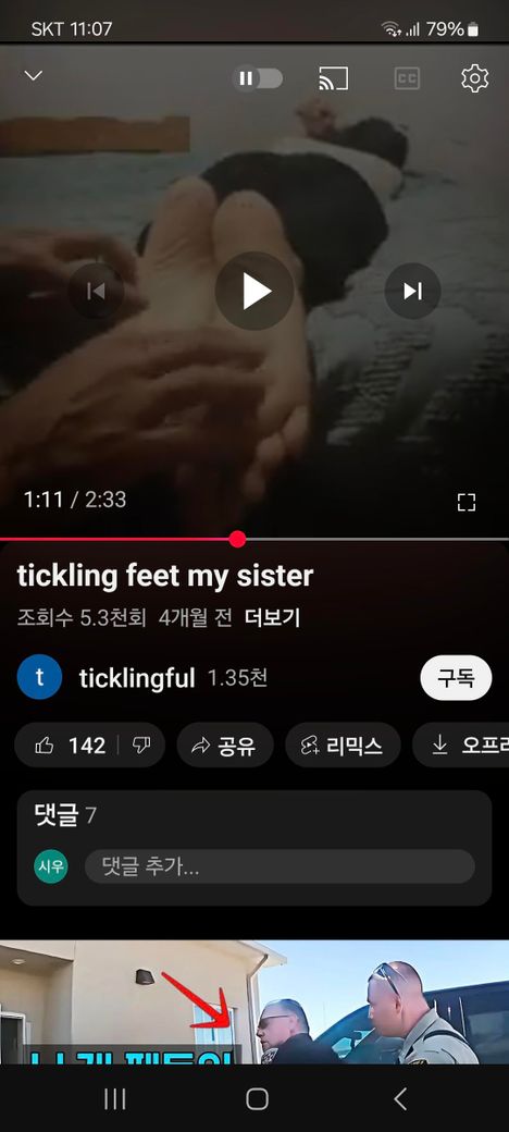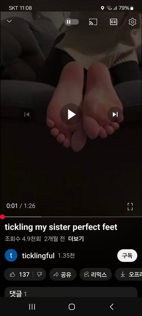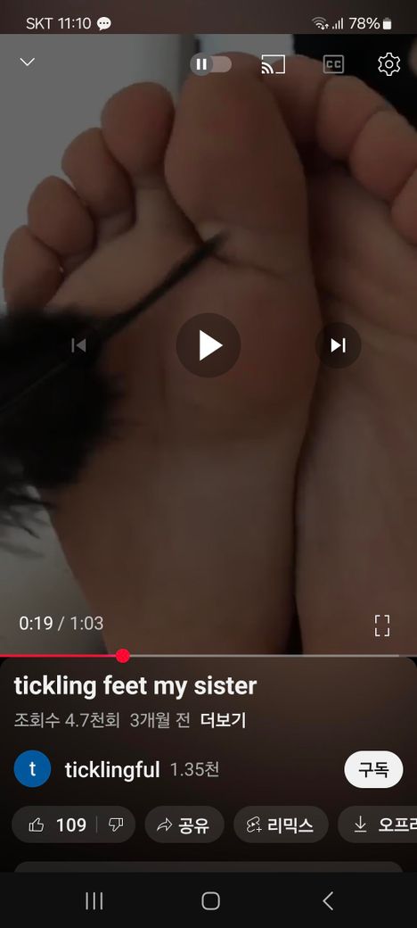 이건 동생이 누나 발바닥 간지럼 태우는 영상인데 이런 간지럼 어떤가여 일상적인 간지럼이긴 한데 누나 쪽(티클리) 웃음소리가 매우 큰 영상인데 발바닥이 간지러워서 엄청 웃는 부분이여