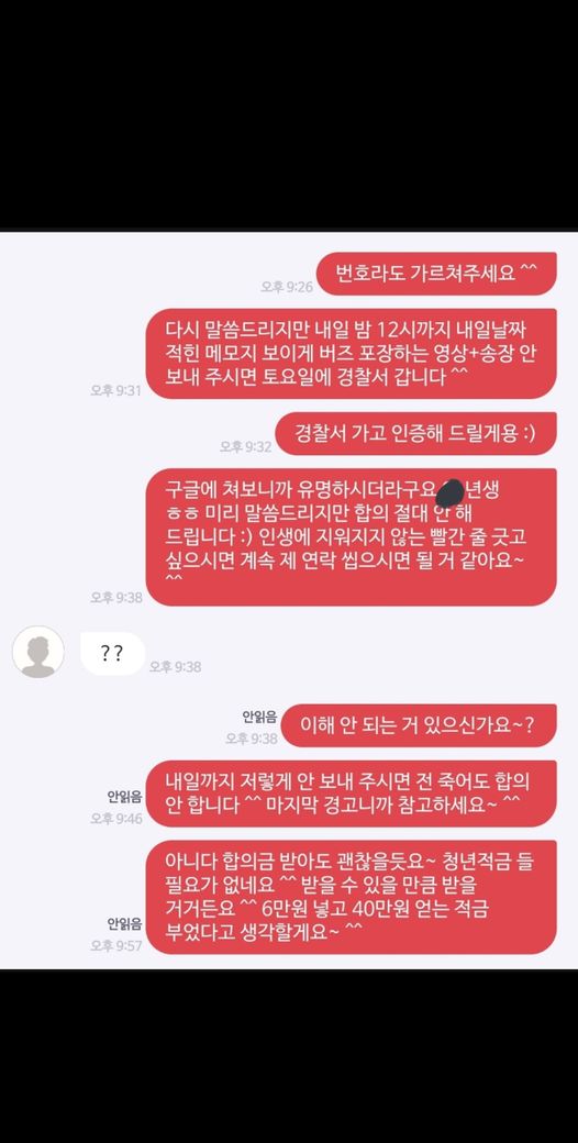 질문 3. 어떤 분이 합의금 목적으로 하는 고소는 취소될 수 있다고 하더라고요. 8번째 캡처 중 합의금 얘기가 마음에 걸려서 여쭤봅니다. 합의금 얘기를 꺼내면 판매자가 마음이 급해져서 제 돈을 돌려 줄까 싶어서 언급했습니다. 실제로 계속 보시면 아시겠지만 실제로는 전 절대 합의할 생각 없습니다. 저렇게 잠깐 언급했다고 해서 취소될 수 있나요?