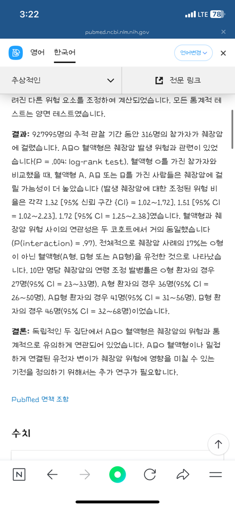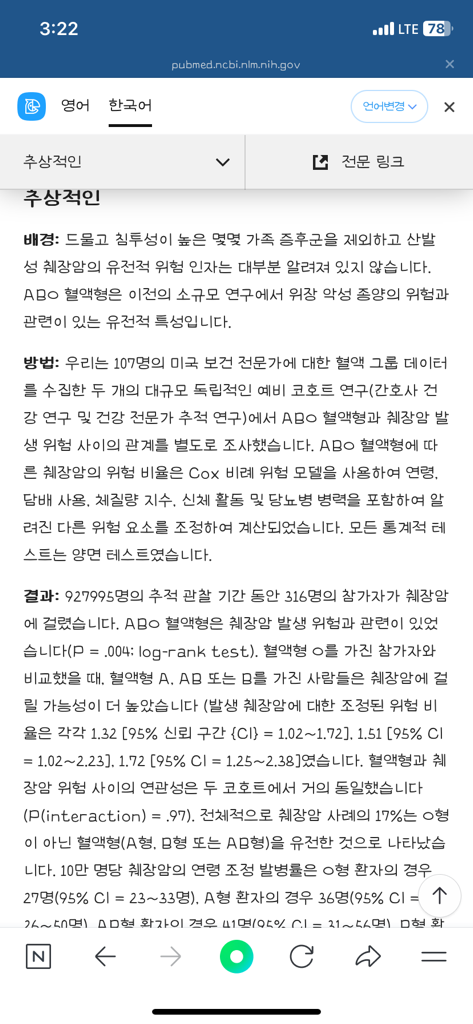 (10만 명당 췌장암의 연령 조정 발병률은 O형 환자의 경우
