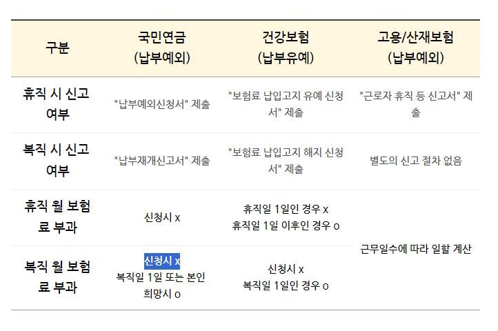 만약 복직일이 1일이 아닌 근로자의 경우, 복직월 건보료랑 국민연금보험료는 부과가 안 될 것입니다.