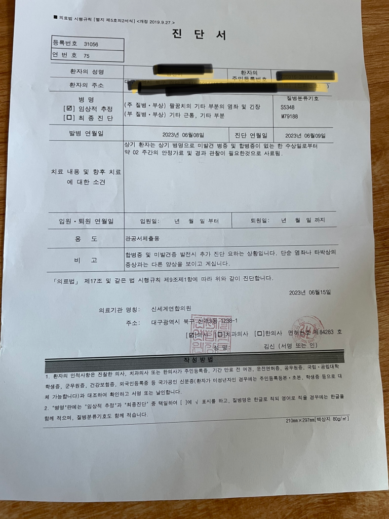 팔등과 팔꿈치에 제키보다 약간 높은곳에서 도어클로져 제품이.떨어져 팔등과 팔꿈치쪽 부상으로 치료중인데 진전이없어 MAR찍어야하나요