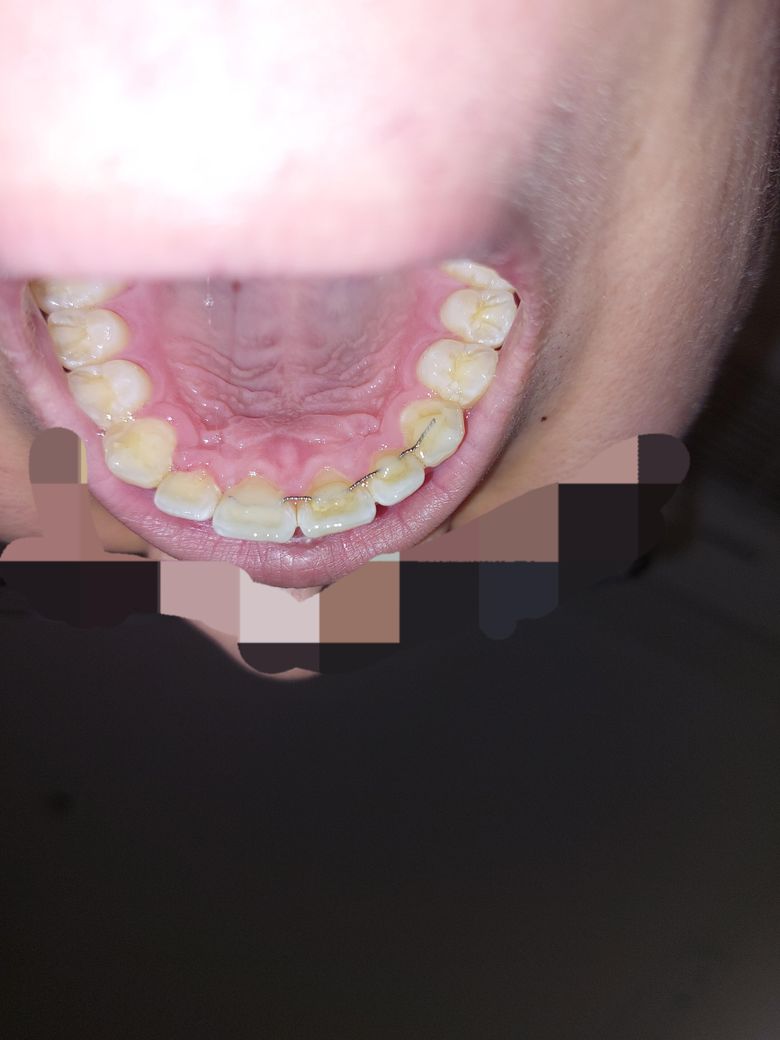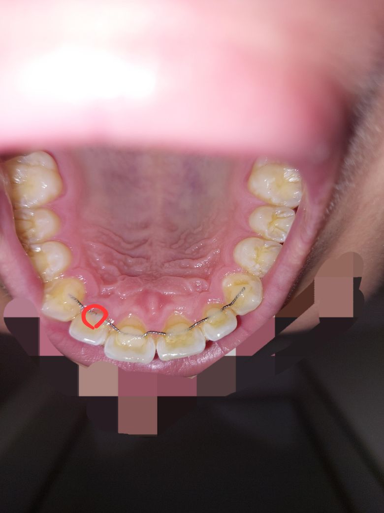 저는 교정끝난지는 7년차고 위 유지장치를 교정끝난직후 현재까지 부착하고있었는데 워낙 오래됐다보니 빨간색부분 철사가 절단됐다길래 아래사진처럼 절단된곳만 잘라내고 레진을 삭제해둔상태인데요.