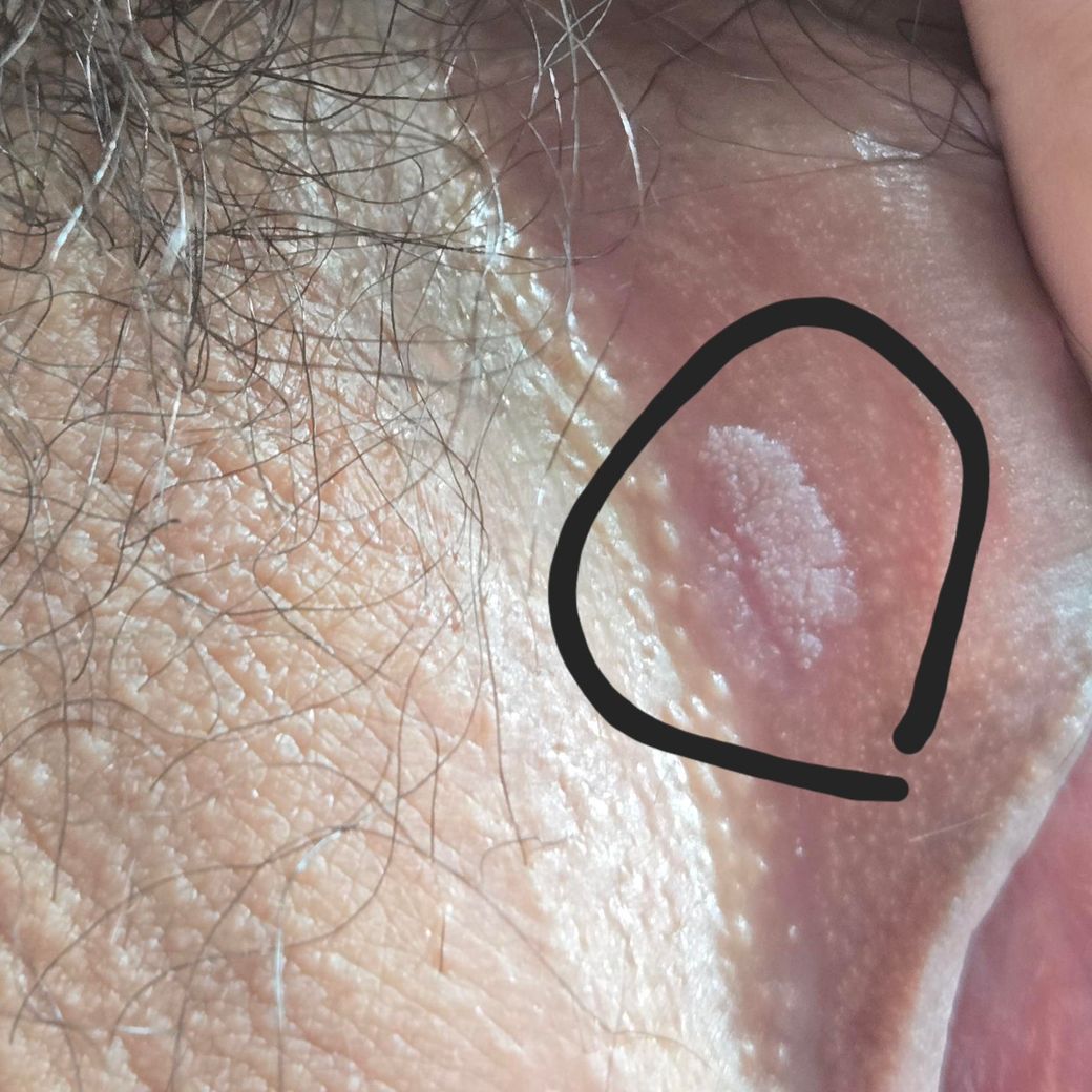 사진에 보이는 병변은 표면이 비교적 평평하고 약간 하얗게 각질처럼 보이는 형태입니다. 한 개의 판처럼 보이며 물집이나 군집된 수포 형태는 관찰되지 않습니다. 이런 형태만으로 특정 질환을 확정할 수는 없지만, 사진에서 보이는 모양만 기준으로 보면 전형적인 성병 병변과는 다소 차이가 있습니다.