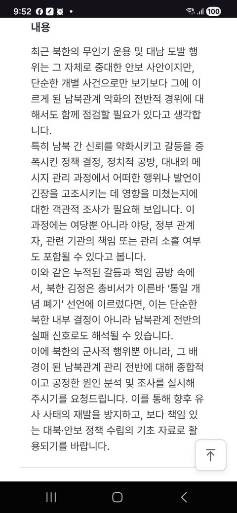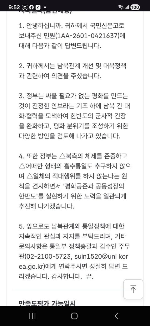국민신문고를 통해 남북관계 악화의 원인, 정책 결정 과정, 책임 소재 및 사후 평가 필요성 등에 대해 비교적 구체적이고 논리적인 민원을 제출했는데, 정작 돌아온 답변은 질문의 핵심과 직접적으로 맞닿지 않은 정부의 기본 원칙이나 일반론적 입장을 설명하는 내용이었습니다.