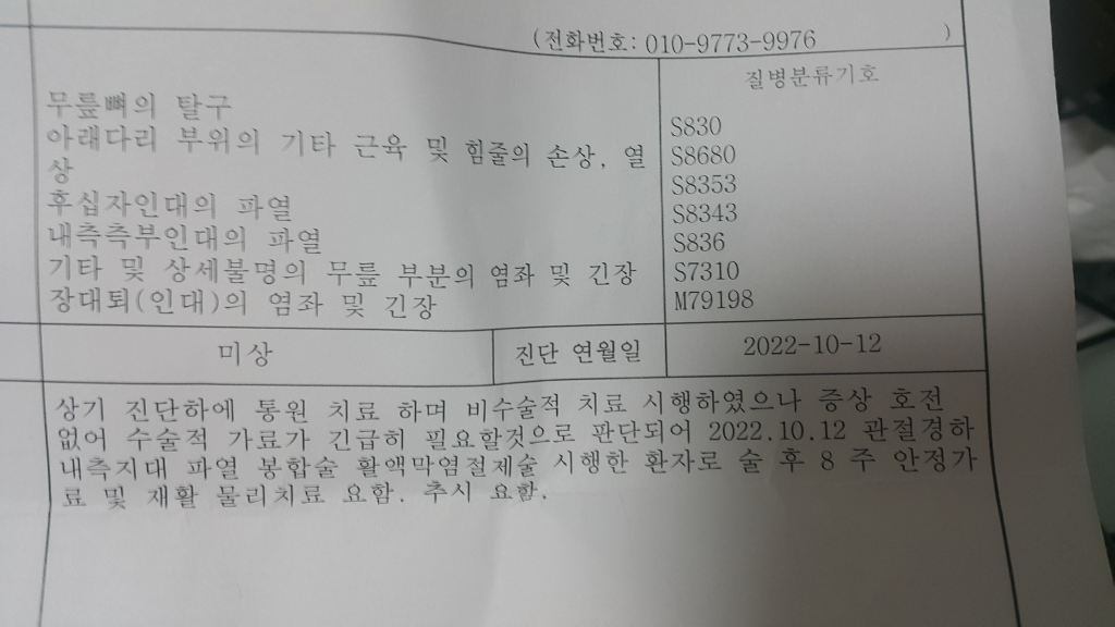 운동하다상해로 사고로 수술하셧다면6개월후 담당의사의 후유장해 진단서를 발급받아 봏님회사에 청구하셔야 됩니다
