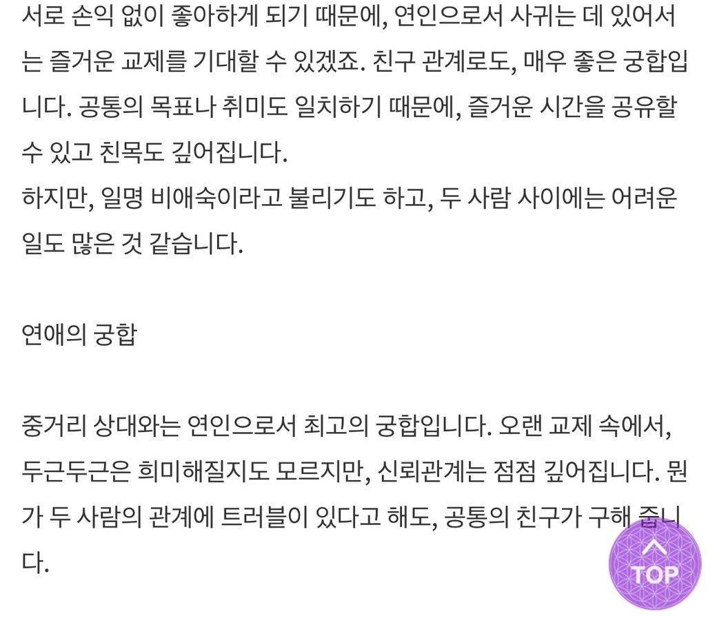 비슷한 점도 많구요 그래서 가끔 아 이 사람이 내 인연 인가 싶기도 하구요. 다른 사주 궁합에서도 천생연분 이라고 나온적 있어요 저정도 풀이면 저희 잘맞는 인연 인가요??