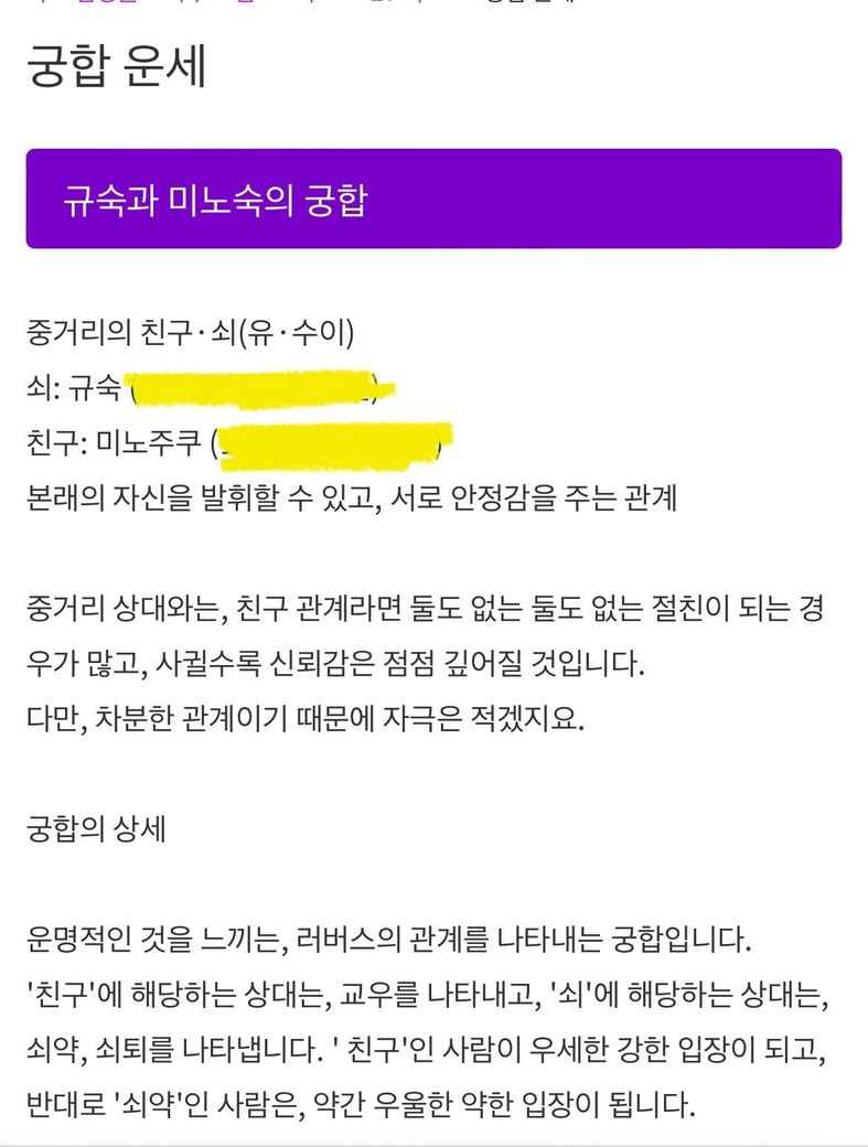 재미로 해본 궁합 인데 은근 잘맞다고 하는 사람들이 많아서 해봤어요. 규숙이 저고 미노조쿠가 남친 이에요 근데 1년 다 되게 만나는중인데 정말 싸운적도 없고 트러블도 크게 없고 편하게 잘만나는중이에요