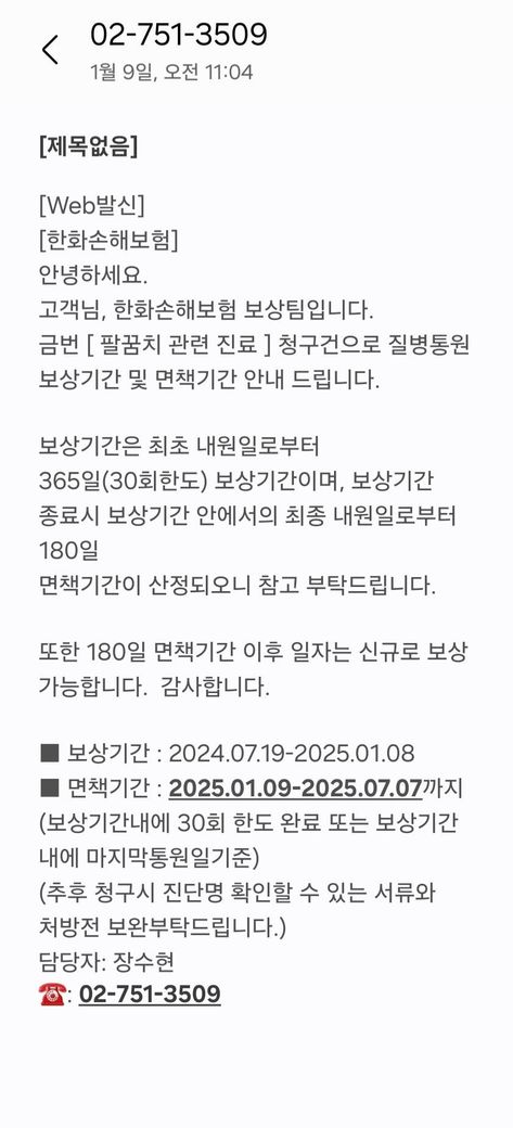중간에 치료를 중단하다가 12월 부터 다시 치료를 받는데 보상한도와 면책기간에 대해서 문자가 왔습니다