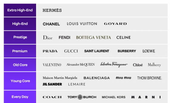 에르메스,구찌,루이비통, 프라다 등은 일반적으로 1티어 또는 최상위 명품 브랜드로 여겨지고 2티어,3티어 등의 등급은 더 낮은 가격대와 상대적으로 낮은 브랜드 가치를 가진 브랜드라고 볼수 있어요.