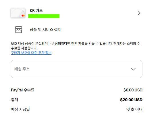 일단 제 한국 페이팔 계정에 연동된 국민은행 신용카드를 이용해 친구의 미국 페이팔 계정으로 $20을 송금하게 되면 첨부한 스크린샷에서처럼 수수료가 0원으로 나왔습니다. 이것을 수령한 미국 친구의 페이팔 계정에는 수수료 $0.90를 제외한 $19.10가 최종적으로 지급되었고요.