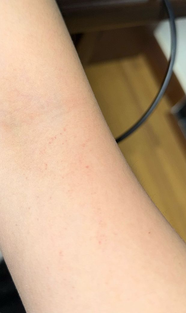 둘째, 모낭 주위 염증 또는 모공각화(keratosis pilaris) 초기 형태입니다. 특히 팔 바깥쪽에 잘 생기며, 작은 붉은 점들이 모낭 중심으로 분포합니다. 다만 사진상은 뚜렷한 각질 돌기보다는 점상 출혈 쪽이 조금 더 의심됩니다.