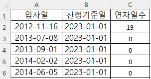 엑셀 연차일수 계산식 함수 관련 문의합니다.