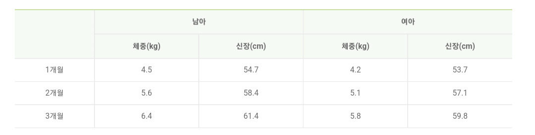 1-3개월 남아의 평균 체중은 4.5~6.4kg, 여아의 체중은4.2~5.8kg입니다. 남아의 신장은 54.7~61.4cm, 여아의 신장은 53.7~59.8cm입니다. 이 시기에는 키와 몸무게의 증가가 두드러지게 나타납니다.
